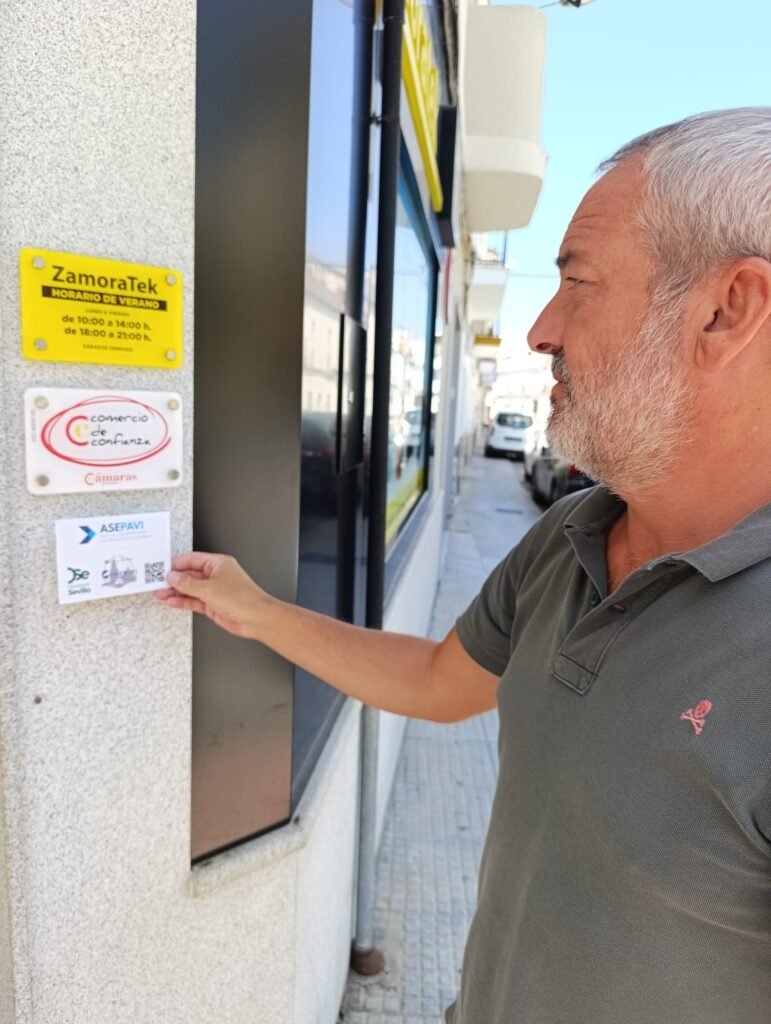 Ahora cada asociado tendrá en su establecimiento una pegatina que lo identificará como miembro de la “Marca Local Comercio Los Palacios”. Durante la mañana de hoy, varios miembros de Asepavi junto con Manolo Ruiz como presidente de la entidad, han visitado varios comercios para hacerles entrega de estas pegatinas con las que se quieren dar un impulso al comercio y al tejido empresarial local.